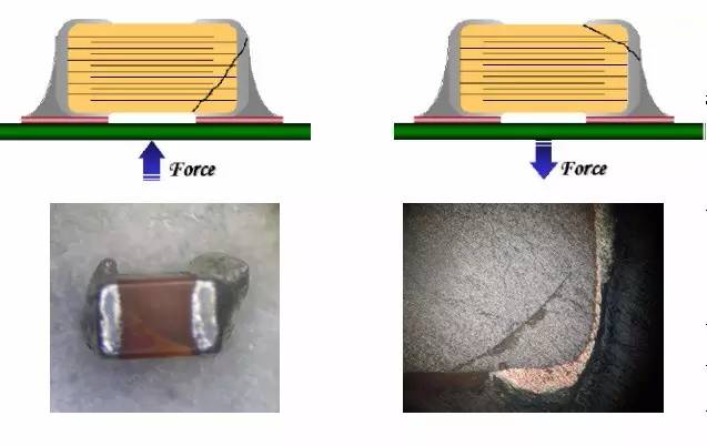 電路板切割﹑測試﹑背面組件和連接器安裝﹑及最后組裝時,若焊錫組件受到扭曲或在焊錫過程后把電路板拉直,都有可能造成‘扭曲破裂’這類的損壞。在機(jī)械力作用下板材彎曲變形時,陶瓷的活動范圍受端位及焊點限制,破裂就會在陶瓷的端接界面處形成,這種破裂會從形成的位置開始,從45°角向端接蔓延開來。